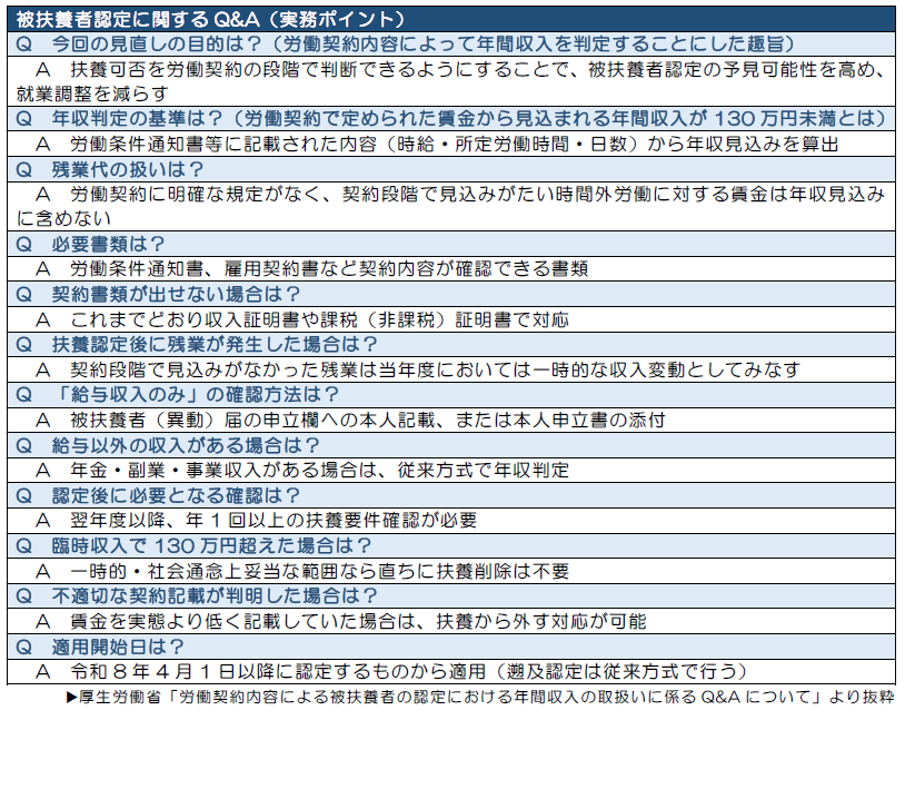 お知らせ 令和8年度からの被扶養者認定についてQ&A 2026年01月09日(金) 令和8年4月1日以降の被扶養者認定の取扱いについて、厚生労働省よりQ&Aが公表されました。従業員から扶養内での働き方の相談を受けた場合には、個々の契約内容に基づいて判断されることを事前に説明するとともに、従業員が自身の契約内容を正しく理解できるよう配慮することが重要です。今回のQ&Aを参考に、契約書類の整備や説明の準備を進めましょう。 【厚生労働省】 被扶養者の認定における年間収入の取扱いに係るQ&A (SIZE:146.41KB)