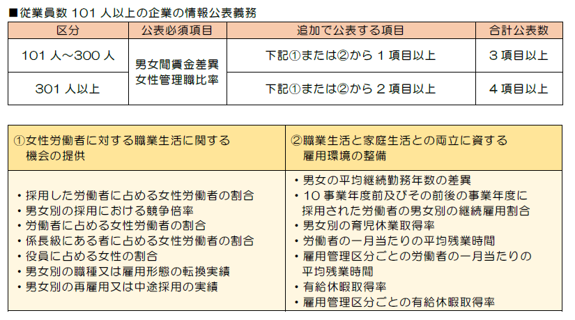 今回の改正により、従業員数101人以上の企業は、「男女間賃金差異」および「女性管理職比率」の公表が義務付けられます。また、従業員101人以上300人以下の企業は、これら2項目に加えて、「女性の活躍状況」または「両立支援に関する実績」から1項目以上を選択し、合計3項目以上を公表する必要があります。従業員数301人以上の企業については、「女性の活躍状況」から1項目以上、「両立支援に関する実績」から1項目以上を選択し、合計4項目以上を公表しなければなりません。従業員数100人以下の企業は、努力義務の対象となります。