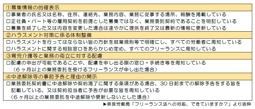 令和6年11月1日に施行されたフリーランス・事業者間取引適正化等法(いわゆる「フリーランス法」)に関連するトラブルが増えていることを受け、奈良労働局がチェックリスト付きのリーフレットを公開しました。